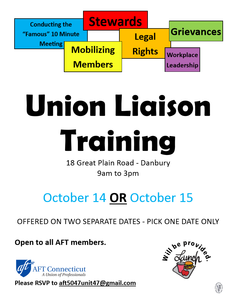 First Opportunity is Union Liaison Training—formerly called Unit Representatives. There is one training sessions being offered on two separate dates, 10/14 & 10/15, same training. We are trying to work around schedules, come learn about what a Union Liaison is all about.